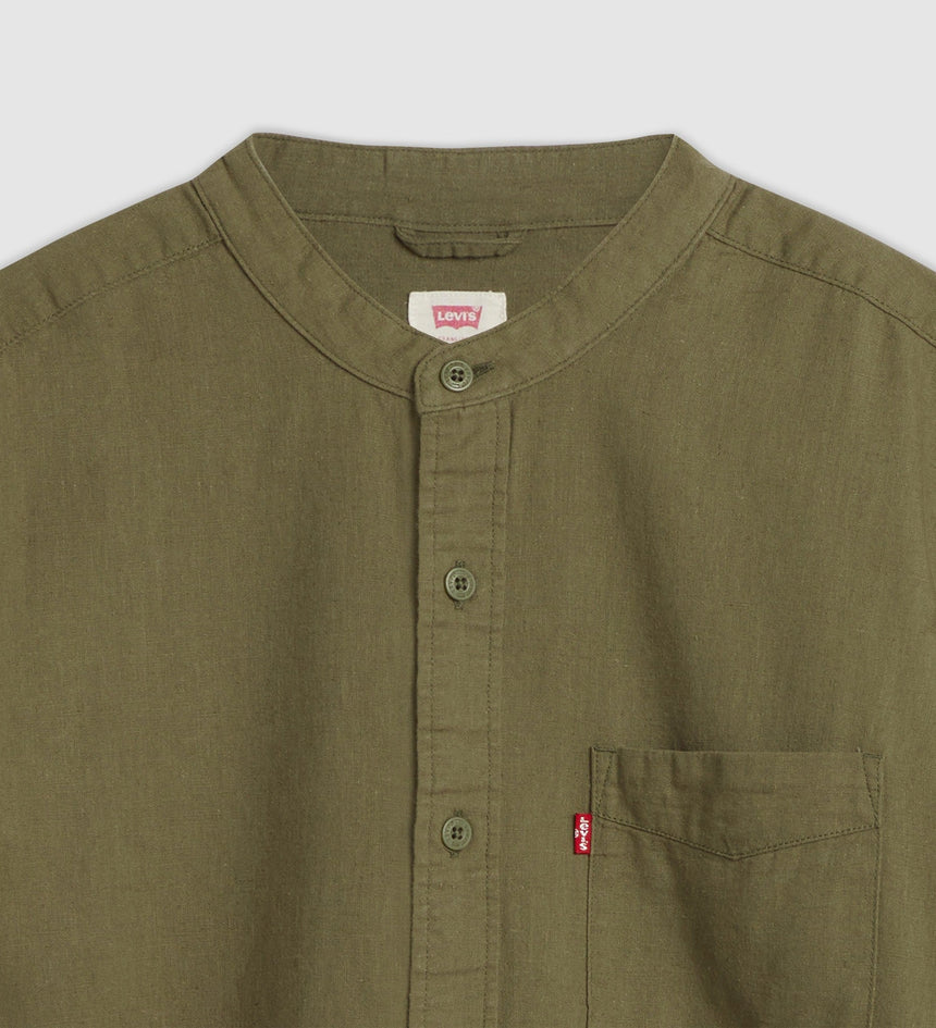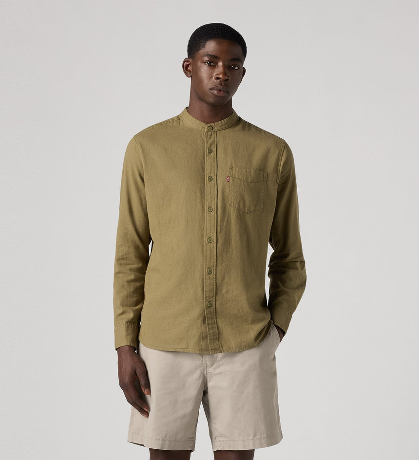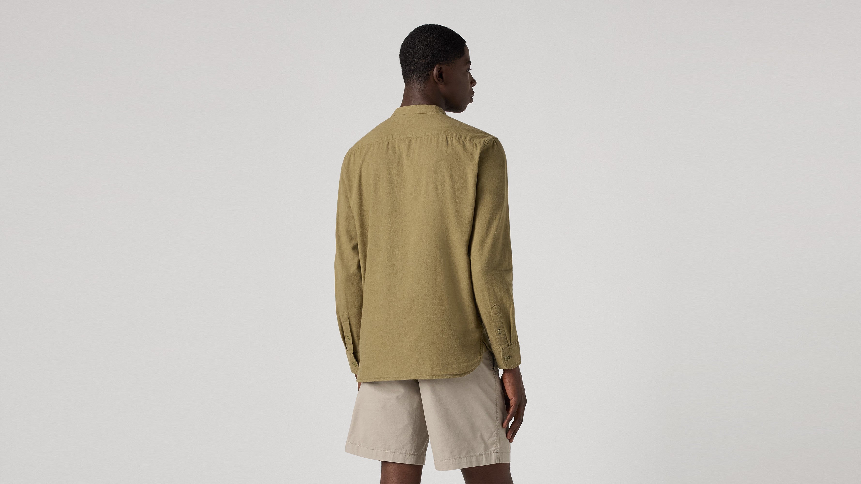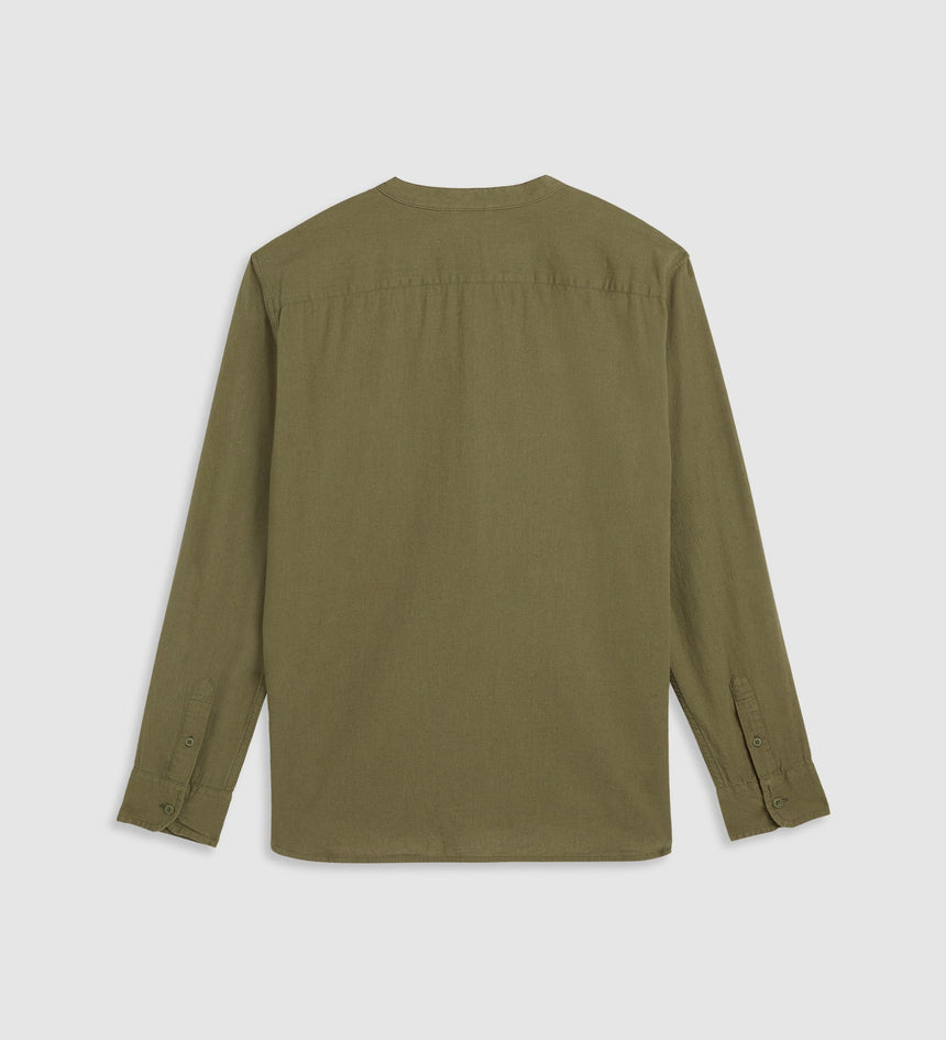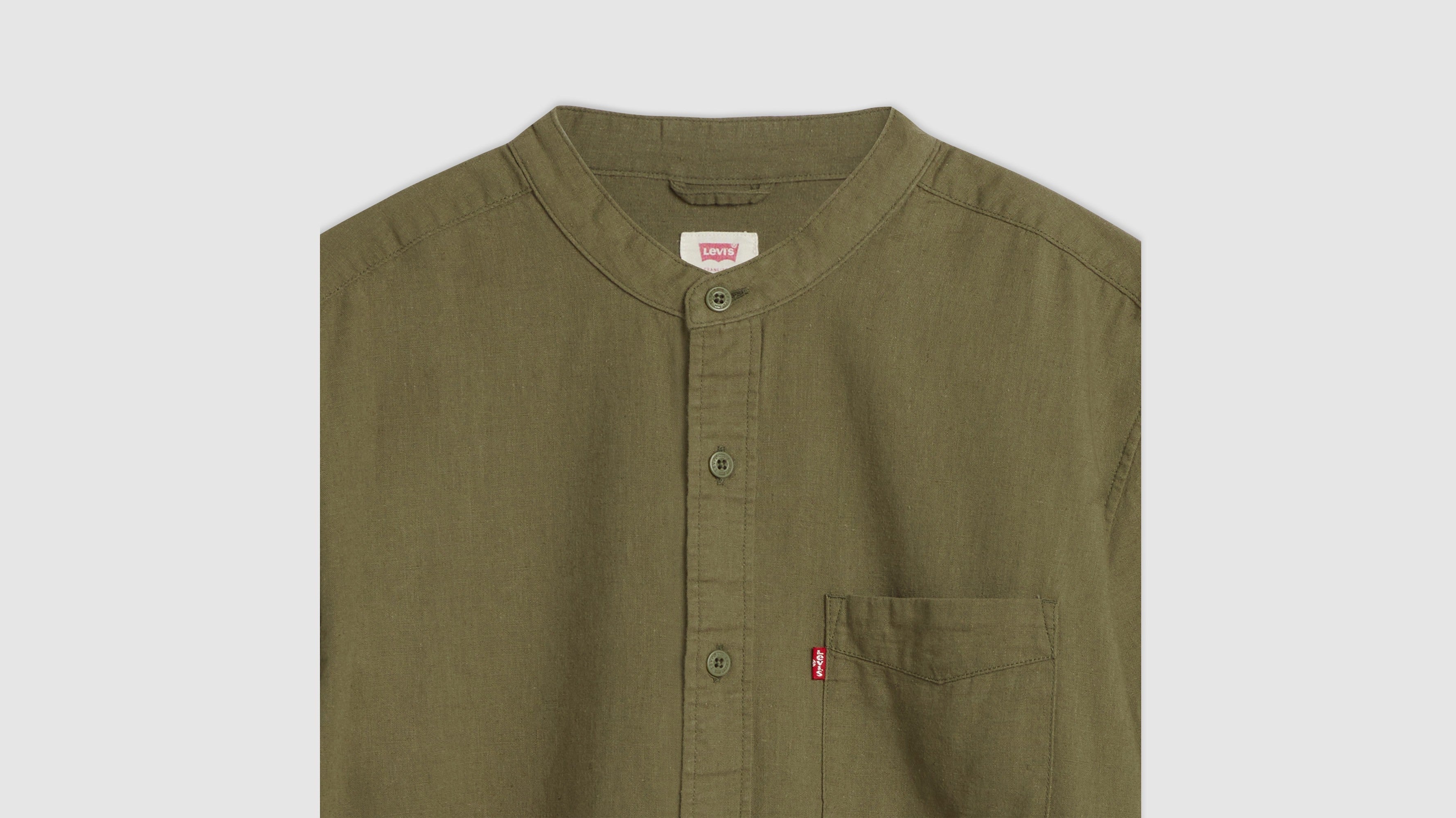 - An elevated banded collar shirt