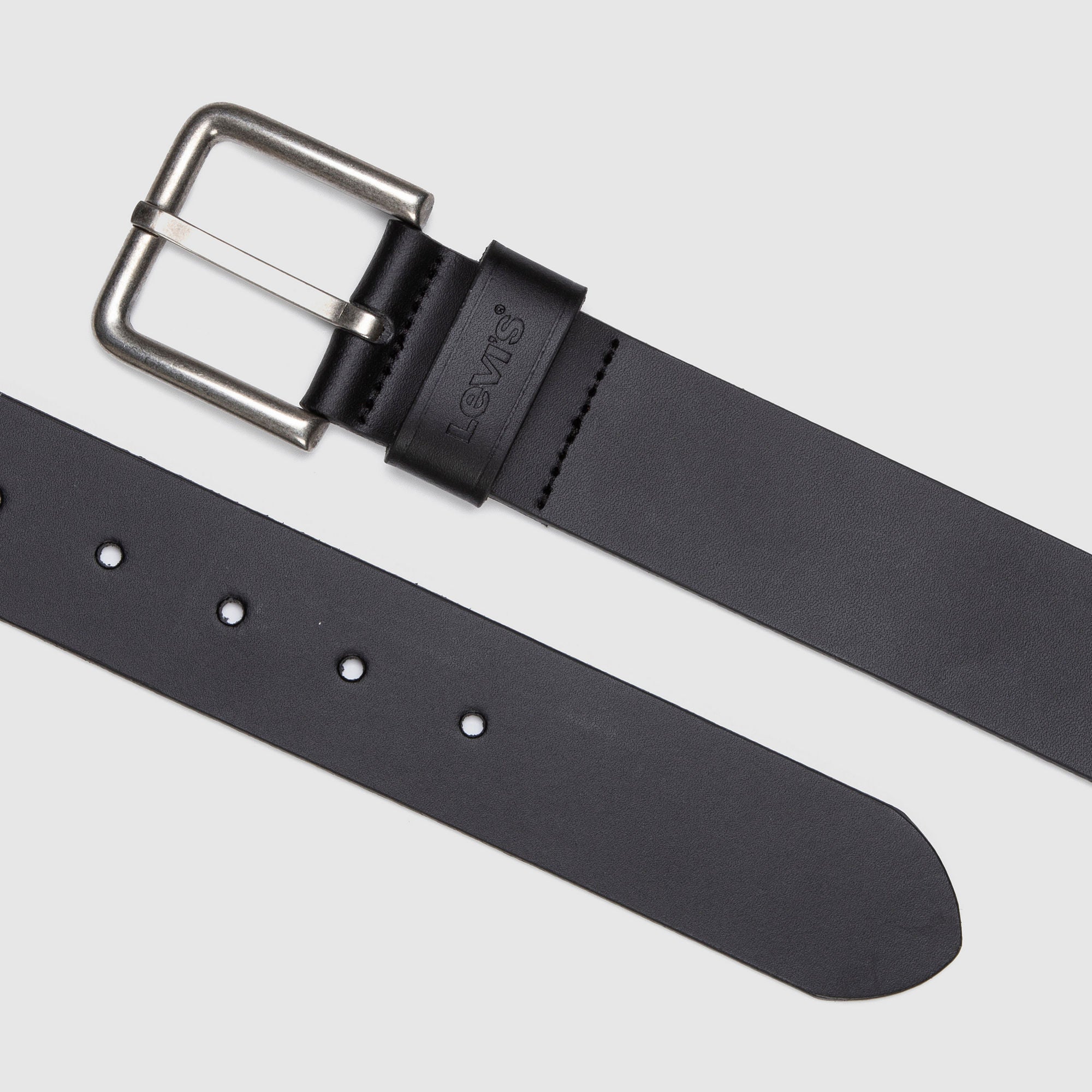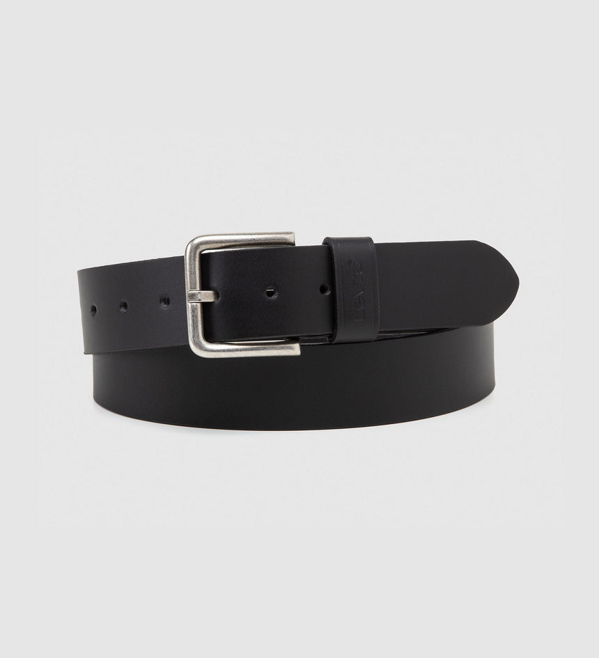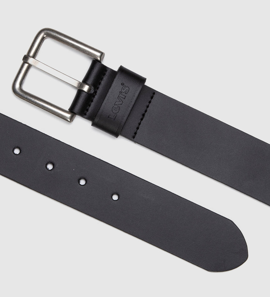 - A leather belt with a classic square buckle