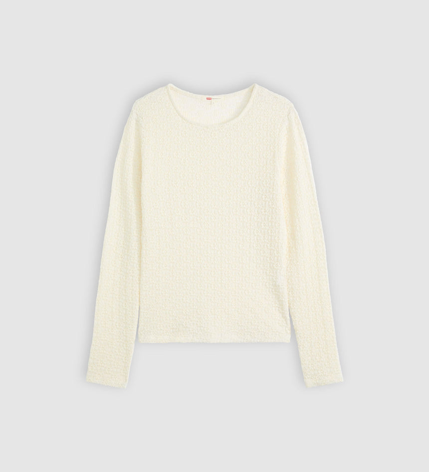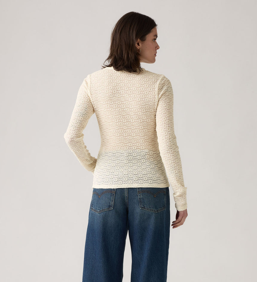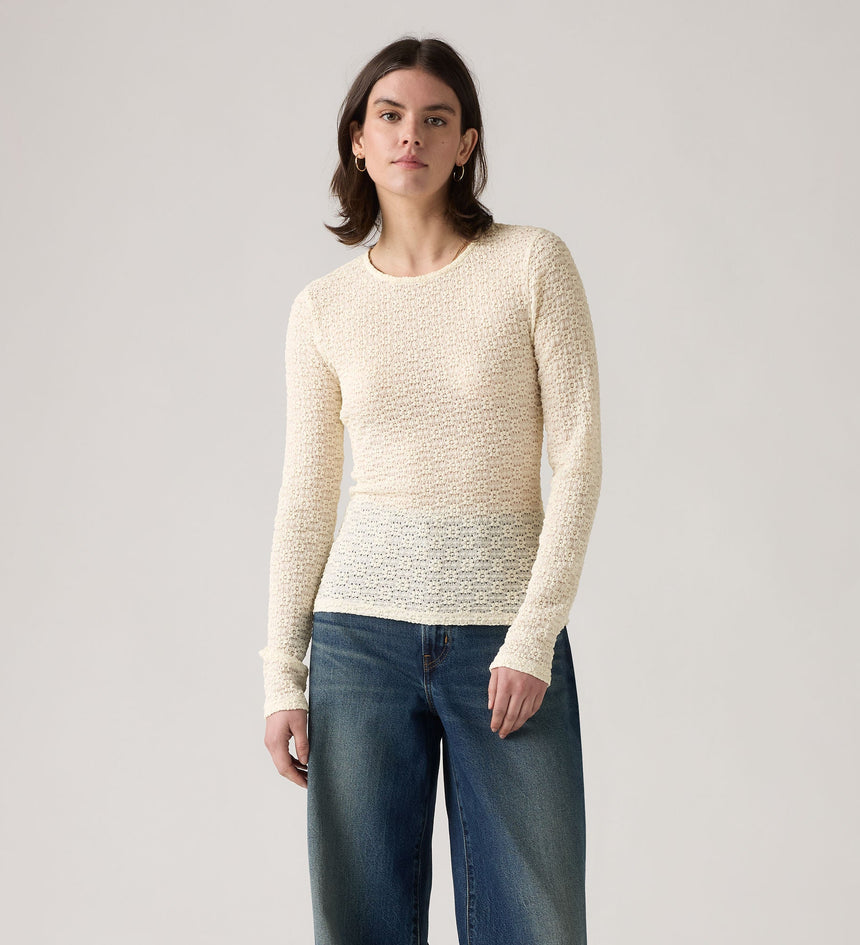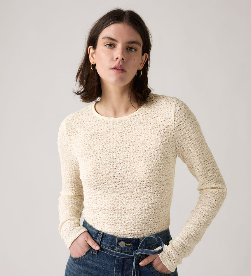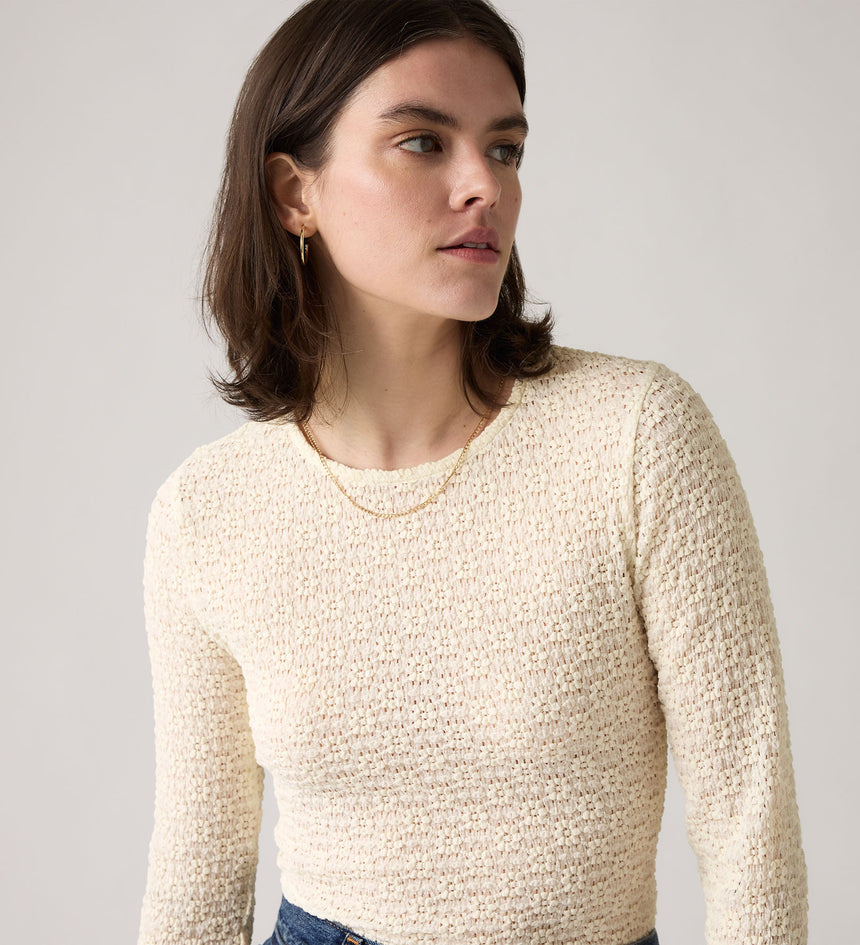 A sheer long-sleeve that isn't boring. Our Anika Crewneck Top features a high crew neckline and an ultra-flattering slim fit with a playful pattern.